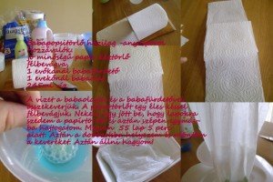 Elkészítése: a papírtörlőt ketté vágom, ha nincs elég éles késetek, akkor kenyérvágó késsel is ketté lehet vágni. Aztán én lapokra szedem és egymásba hajtogatom, lásd kép, így kerül a popsitörlős dobozba, később ha húzom ki, jön a következő papír is utána, mint az eredeti popsitörlőnél. Aztán a dobozba helyezett papírokra ráöntöm a folyadékot. Hagyom állni, ha túl sok lenne rajta a nedvesség, akkor ki lehet nyomkodni, ha kiszáradna, akkor utána lehet önteni! Ki kell tapasztalni! Aztán már menni fog, én már 3 hónapja ezt használom és meg vagyok vele elégedve, nagyon, mindig egy- egy adagot készítek el és aztán frissen a következőt.
